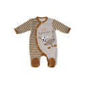 Pyjama en velours beige et moutarde. Les manches et une partie du corps sont à rayures, le reste est en beige.