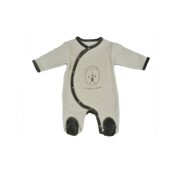 Beige avec imprimé hérisson devant et ouverture croisée devant.