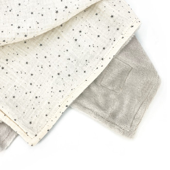 Couverture avec un tissu polaire beige ultra doux d'un côté et un tissu en coton imprimé de l'autre.
