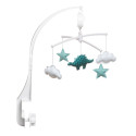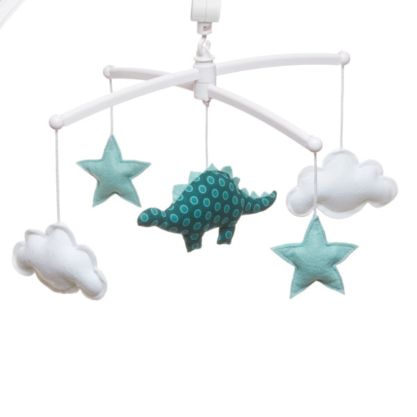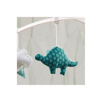 Ce mobile musical bleu canard est un incontournable des listes de naissance. Joyeux et poétique, il décorera la chambre de bébé. Le dinosaure, entouré de ses étoiles grises et de petits nuages blancs bercera le nouveau né au rythme d'une douce mélodie "la Valse d'Amélie Poulain".