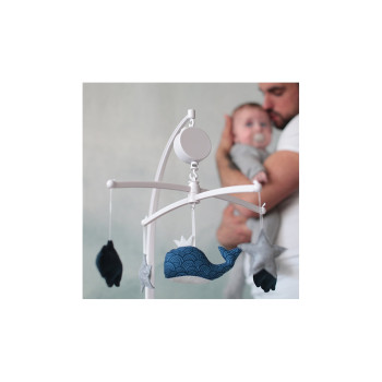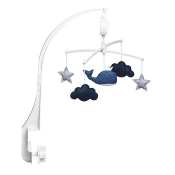 Indispensable du trousseau de naissance, un mobile musical baleine bleu marine très poétique pour décorer la chambre de bébé. La baleine majestueuse entourée de ses nuages et étoiles bercera le nouveau né au son d'une douce mélodie "la Valse d'Amélie Poulain".