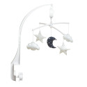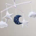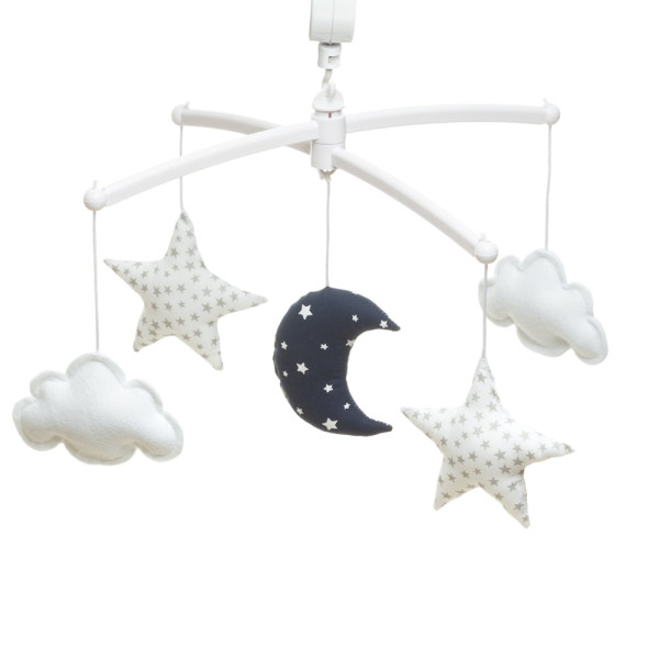 Indispensable du trousseau de naissance, un mobile musical blanc et bleu marine tout en douceur et poésie pour décorer la chambre de bébé. Bercé par une douce mélodie "Over the rainbow", le nouveau-né aura la tête dans les étoiles et les nuages.