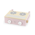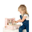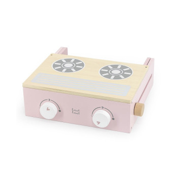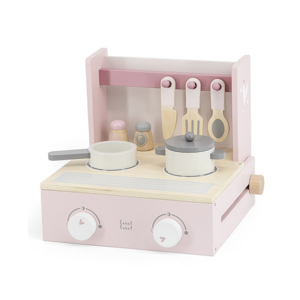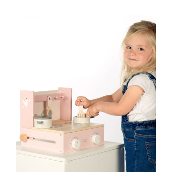 La cuisinière pliable est faite de bois certifié FSC de qualité et a été décoré avec de douces couleurs roses en utilisant de la peinture à base d’eau non nocive.