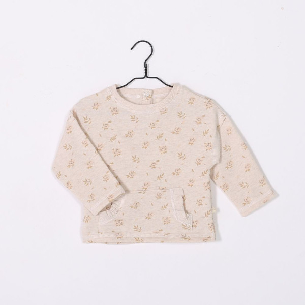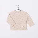 Un joli sweat à manches longues, pour les petites filles et les bébés. Coloris crème. Plein de poésie et de tendresse avec sa petite poche kangourou volantée et son imprimé roses.