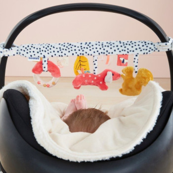 Toutes ces activités favorisent à la fois l'éveil tactile et l'éveil visuel de l'enfant. Cette spirale d'activités s'accroche facilement aux barreaux du lit, du parc ou sur la poussette.