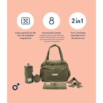 Plus qu’un simple sac à langer, le Fluffy inclut 8 accessoires essentiels pour faciliter chaque déplacement :