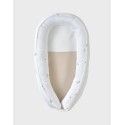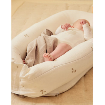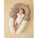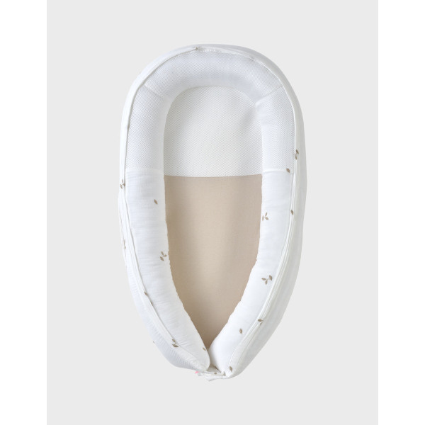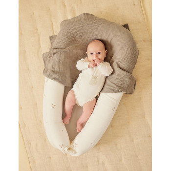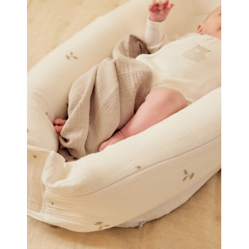 Son extérieur en gaze de coton BIO, brodé de jolis motifs inspirés de la nature, est d’une extrême douceur pour la peau sensible de bébé. À l’intérieur, un rembourrage en microbilles souples offre un maintien moelleux et confortable, comparable à celui d’un coussin ergonomique.