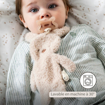 Un doudou tout en douceur… avec la tétine toujours à portée de main.