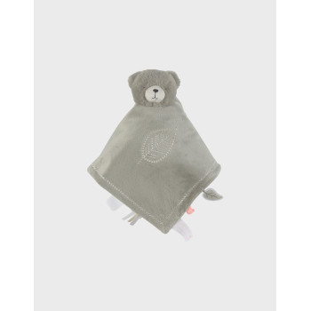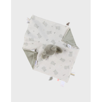 Éveil sensoriel : confection bi-matière (Veloudoux® doux d’un côté, gaze de coton BIO légère de l’autre) avec étiquettes ludiques à manipuler.