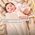 Grâce à la fermeture éclair latérale, qui s’ouvre de bas en haut, le change devient simple et rapide, même en pleine nuit. Et pour les déplacements en toute sécurité, elle dispose d’une ouverture pour harnais, compatible avec les sièges-auto ou transats.