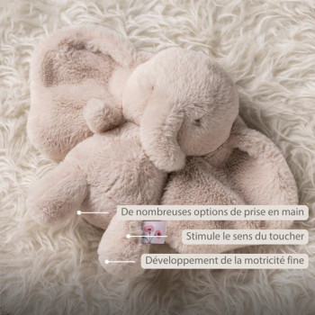 Stimule le toucher et la motricité fine grâce à la trompe, aux oreilles et aux pattes