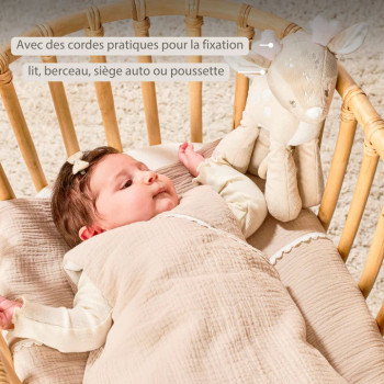 Grâce à ses cordons pratiques, ce doudou musical se fixe facilement sur un lit, un berceau, une poussette ou un siège-auto. Avec son design attendrissant et ses textures douces, il stimule les sens tout en rassurant bébé. Un cadeau de naissance idéal pour créer un cocon de douceur et de sécurité.