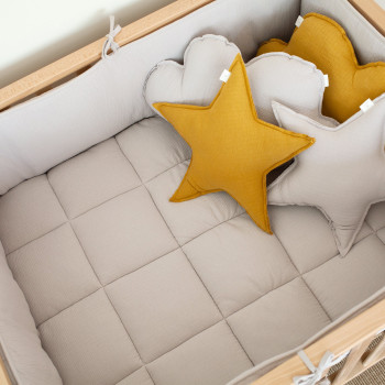 Le tour de parc est le complément indispensable au tapis pour protéger bébé des barreaux. Grâce aux nouettes, il s’attache facilement en toute sécurité.