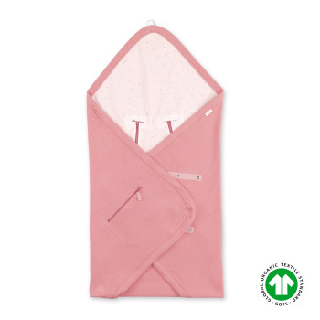 La couverture enveloppante s’installe directement sur la coque et grâce à son ingénieux système d’ouvertures zippées, il est très simple de faire passer les ceintures afin de fermer correctement le harnais de sécurité au plus près du corps de bébé. Convient pour un bébé de 50 à 75 cm.