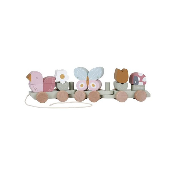 Ce train en bois est prêt pour une nouvelle aventure dans le jardin en fleurs. Olivia, le petit oiseau rose, te montre les plus belles fleurs et les plus jolis papillons.