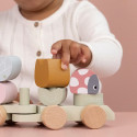 Fais preuve d'imagination pour construire le train à l'aide des blocs à empiler de différentes formes et dans des couleurs oniriques. Il y a trois wagons à empiler sur un oiseau, des fleurs, un papillon et une coccinelle.
