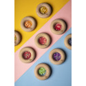 Notre nouveau jouet sensoriel est une véritable gourmandise pour les petits ! Ce hochet en bois en forme de beignet est conçu pour être manipulé confortablement par les petites mains curieuses. À l’intérieur, des formes de fruits et légumes cachent un son irrésistible, typique de notre marque, qui captera toute l’attention de votre bébé à chaque secousse.