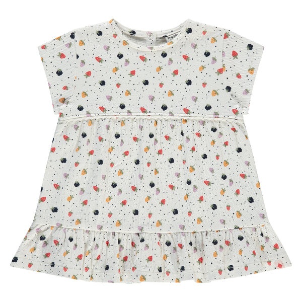 Optez pour cette robe pour bébé fille, idéale pour allier confort et style. Confectionnée en ivoire, elle est décorée de petites baies et de petites fraises, apportant une touche joyeuse et colorée à la tenue de votre petite. Parfaite pour toutes les occasions, cette robe offre une grande liberté de mouvement tout en étant douce et agréable à porter.