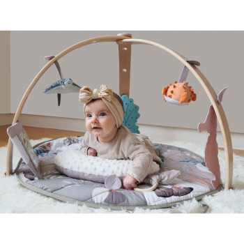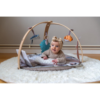 Les arches en bois de haute qualité suspendent des peluches adorables qui encouragent l’éveil sensoriel de bébé. Le tapis, douillet et réversible, est entouré de petites figurines en feutre conçues pour stimuler ses sens et son imagination.