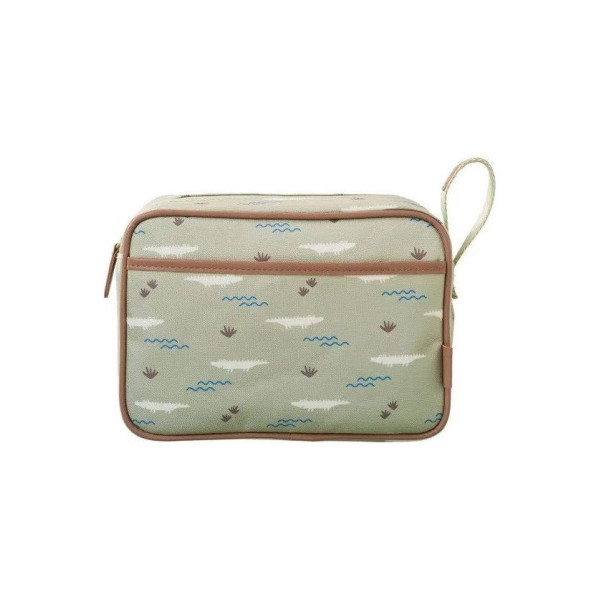 Cette trousse de toilette écrue aux imprimés crocodiles est imperméable.