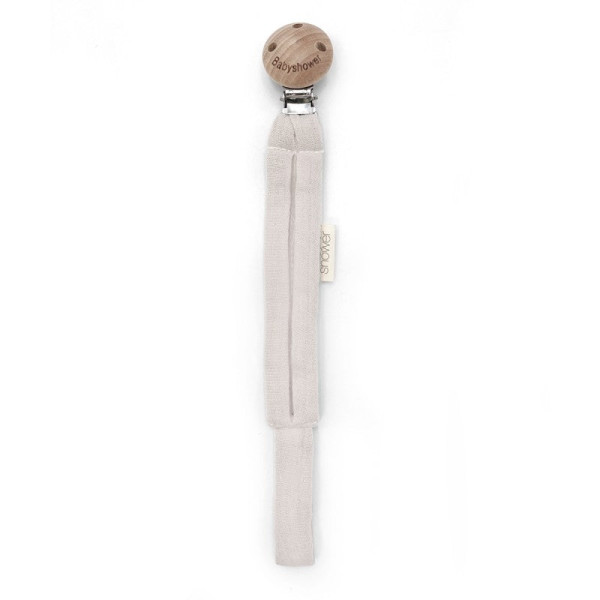 Pince en bois pour attacher la sucette. La partie en bois se fixe aux vêtements du bébé et la sucette à la sangle en tissu.