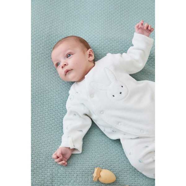 Le pyjama est soigneusement confectionné avec un velours côtelé, une application toute douce brodée d’un lapin et d'un élégant passepoil vert d'eau. Son petit plus : la pression personnalisée arborant le sourire de Nouky.