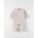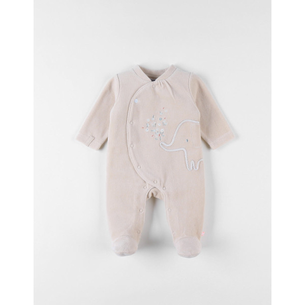 Le pyjama est soigneusement confectionné avec un velours côtelé, une broderie raffinée de l'éléphant, un élégant passepoil beige et une pression personnalisée arborant la fleur. Ses petit plus : ses fronces au niveau du col et son contour d'éléphant brodé en corde.