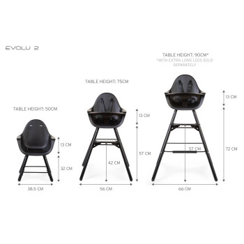 La chaise haute tendance Evolu propose une version spéciale entièrement noire. L'Evolu Black a un look moderne. Cette chaise haute tendance 2-en-1 peut être ajustée à 2 hauteurs de table: une table à manger standard de 75 cm et une table pour enfants de 50 cm. Un ensemble de pieds extra longs est disponible en option afin d’ajuster la hauteur de la chaise haute à un îlot de cuisine de 90 cm. Grâce à l'assemblage facile, le changement de hauteur est très facile. Le siège d'enfant peut également être utilisé dès la naissance en combinaison avec le siège nouveau-né. La tablette repas réglable en profondeur est disponible en option, de sorte que votre enfant a sa propre table. La chaise haute Evolu est dotée d'une ceinture de sécurité à 5 points et d'un arceau amovible pour assurer la sécurité de votre enfant.