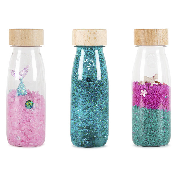 Les sound bottles Mermaid et unicorn ainsi que la float bottle turquoise sont idéales pour stimuler les sens des enfants à partir de 3 mois. Avec leur format pratique, elles sont faciles à saisir et à manipuler par les petites mains.