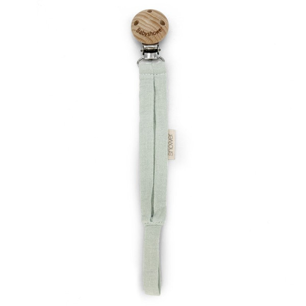 La partie en bois est fixée aux vêtements du bébé et la sucette à la bande de tissu.