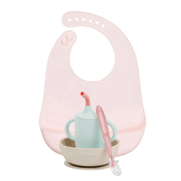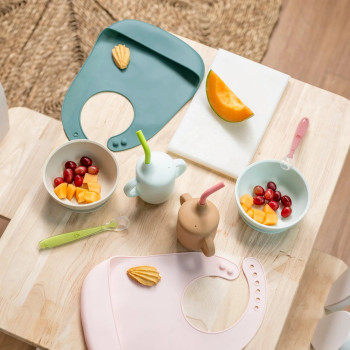 Ce service de table en silicone souple et sans BPA contient tout ce dont votre bébé a besoin pour faire de chaque dîner un festin. Le bavoir souple avec bac récupérateur est spécialement conçu pour éviter les éclaboussures, tandis que le gobelet avec paille assortie, la cuillère et le bol sont ergonomiquement adaptés à la petite bouche et aux doigts délicats de votre chéri. Cet...