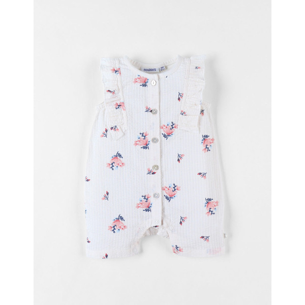 La combishort en crêpe de coton est qu'il faut avoir lorsqu'il fait chaud! La combishort vanille a un joli imprimé fleuri et des volants incrustés au niveau des emmanchures.