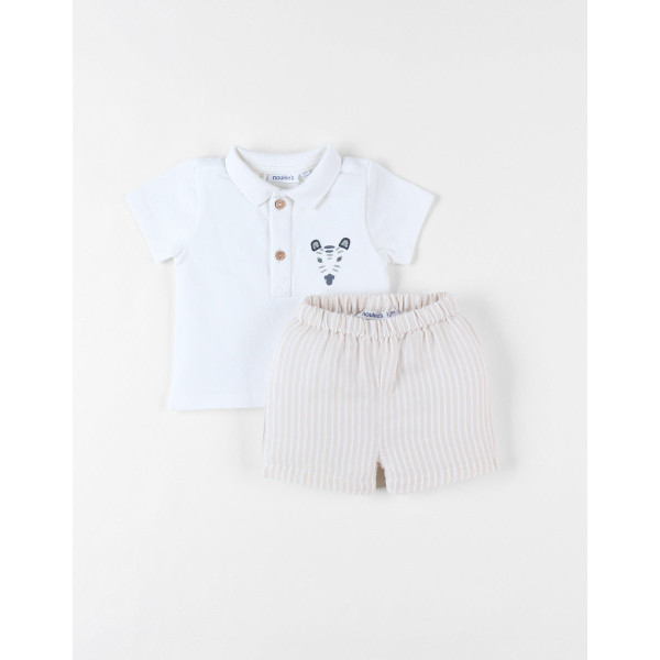 Le set en coton composé d'un polo écru en piqué de coton et un short rayé beige en popeline sera l'indispensable de la garde-robe de votre petit bout cet été !