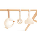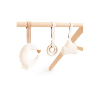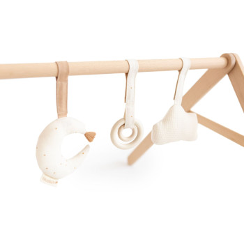 Afin d'aider bébé à découvrir le monde qui l'entoure, des jouets d'éveil en coton bio et bois d'érable massif se fixent à l'arche grâce à des velcro : ajustez donc leur hauteur à votre guise !