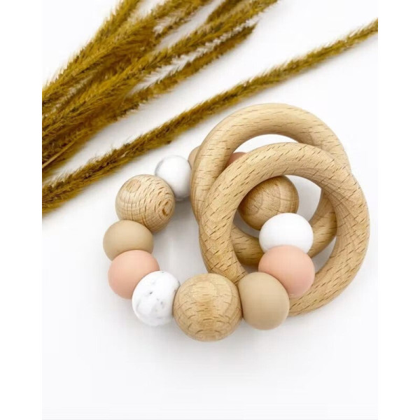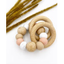 Anneau de dentition/hochet dans les couleurs vieux rose, marbre et taupe clair. Avec trois perles rondes en bois de hêtre de 20 mm et deux anneaux en bois de hêtre.