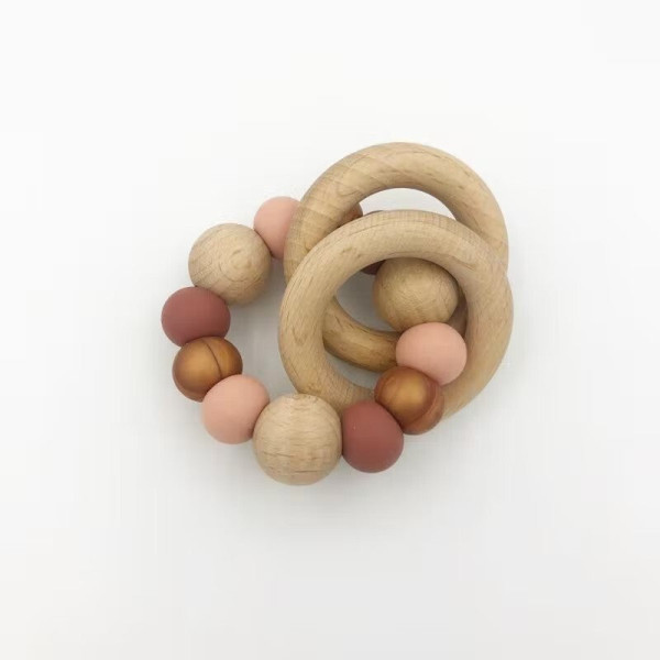 Anneau de dentition/hochet dans les couleurs marsala, vieux rose et cuivre. Avec trois perles rondes en bois de hêtre de 20 mm et deux anneaux en bois de hêtre.