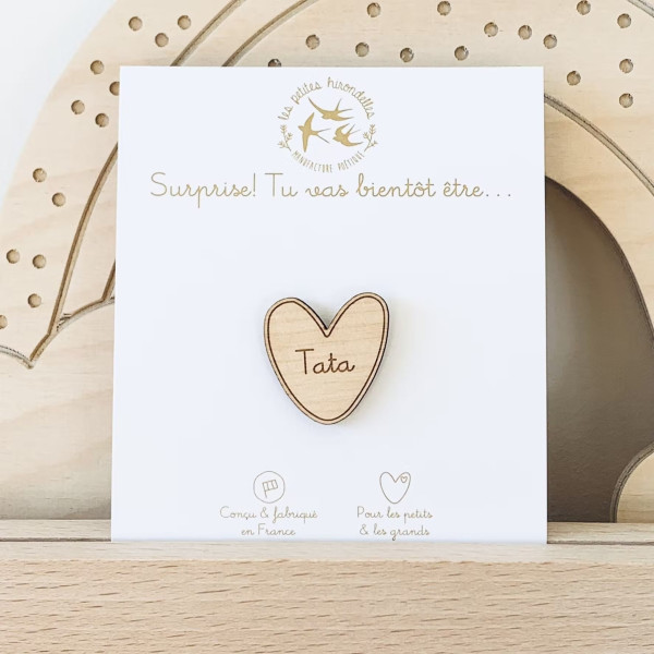 Pour une annonce de grossesse originale, ces jolis pin’s en bois pourront annoncer aux personnes de votre famille qu’elles seront bientôt Maman ou Papa, Mamie et Papi, Tata et Tonton, Marraine et Parrain, Grande Sœur ou Grand Frère !