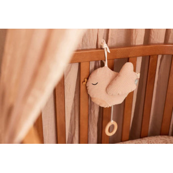 Lorsqu'il tire sur le cordon, l'oiseau diffuse la magnifique mélodie « Lullaby » de Schubert, créant une atmosphère paisible et sereine, idéale pour accompagner l'endormissement de votre bébé. Fabriqué en tissu doux côtelé et agrémenté d'étiquettes colorées et joyeuses, cet oiseau est à la fois un jouet amusant et un véritable élément de confort.