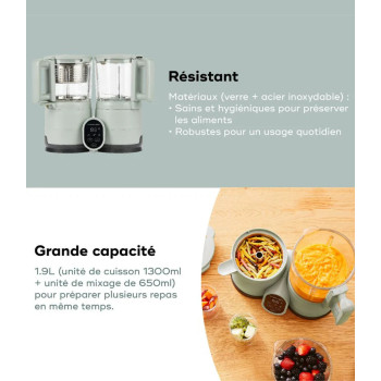 Grâce à son design élégant en verre, il s’intègre parfaitement dans votre cuisine et vous permet de préparer facilement des repas variés pour bébé. De plus, il est réparable et garanti à vie, un gage de qualité et de durabilité. En un seul appareil, vous avez tout ce dont vous avez besoin pour concocter des repas sains et équilibrés pour bébé, tout en gagnant du temps.