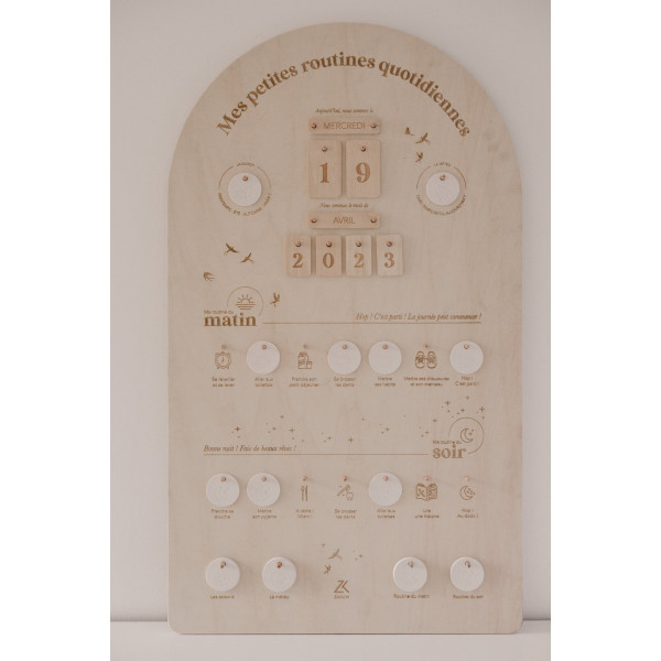 Un outil pédagogique au design raffiné et poétique pour aider les enfants (et les parents !) dans l'apprentissage des petites routines du quotidien. Les pastilles en simili cuir permettent à l'enfant de valider chaque routine effectuée.