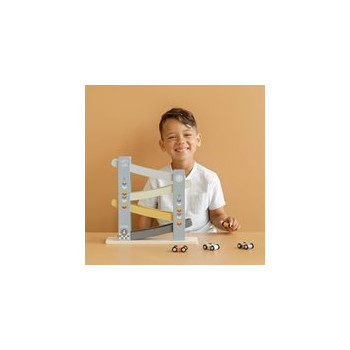 1,2,3 partez ! Cette rampe de course en bois ludique et ses 4 voitures permet à votre enfant de bien s’amuser.