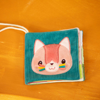 Un livre en tissu aux textures variées et illustrations tendres, parfait pour explorer en manipulant.