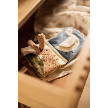 Chaque page révèle un adorable animal à rencontrer : un lapin curieux, un oiseau chantant, un canard joueur et un cygne élégant. Les matières bruissantes invitent bébé à toucher, écouter et manipuler, favorisant ainsi le développement de la motricité fine et de la stimulation sensorielle.