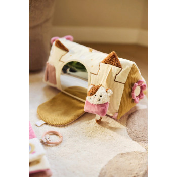 Fabriqué en tissu côtelé doux, ce jouet regorge de surprises à découvrir : un grand miroir, des portes à ouvrir, une calèche brodée, et de multiples éléments sensoriels qui éveillent les sens et la motricité fine. Bébé pourra attraper, tirer, toucher et écouter en toute sécurité.