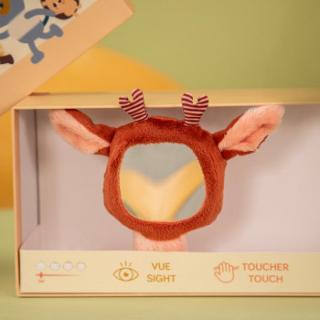 Stella le faon, avec ses oreilles toutes douces et un petit miroir pour se découvrir