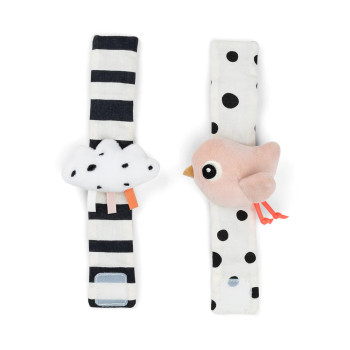 Chaque bracelet est conçu pour être à la fois ludique et pratique : un bracelet est décoré de points et d’un oiseau, tandis que l’autre présente des rayures et un nuage. Grâce à la fermeture velcro, ces hochets s'adaptent facilement aux poignets ou chevilles de votre petit trésor.