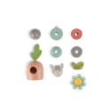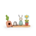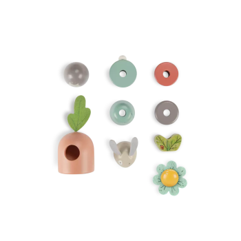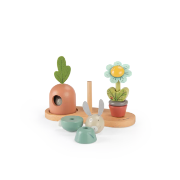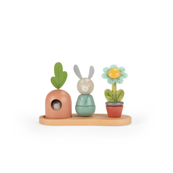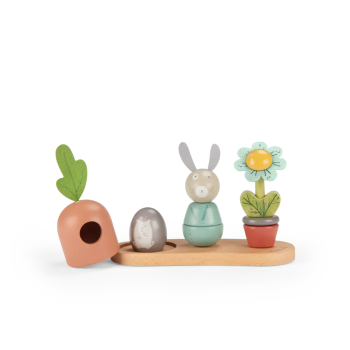 Un jouet à empiler en bois pour développer la capacité de l'enfant à manipuler et compter. Sur un socle en bois, empilez les parties en bois coloré pour recomposer le lapin, la fleur, cacher l'œuf sous la carotte.. ou mélangez-les!