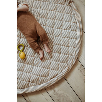 Entrez dans un monde de découverte et d'élégance avec ce tapis de jeu pour bébé, fabriqué en coton organique certifié GOTS. Le design rayures bleues, inspiré par les tons chauds et terreux de la nature, apporte une touche de sophistication tout en offrant un espace agréable pour les moments de jeu de votre bébé. Ces rayures intemporelles sont plus qu'un simple motif : elles incarnent la beauté discrète et la simplicité élégante, tout en symbolisant le voyage de croissance de votre enfant.